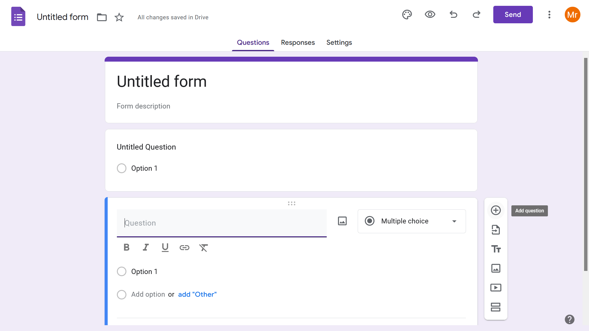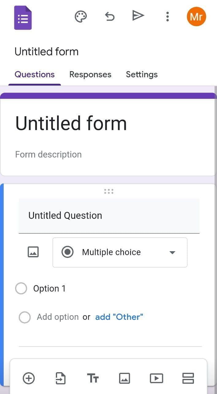 - গুগল ফর্মে প্রশ্ন যুক্ত করার জন্য, ফর্মের ডানপাশের মেনুবার থেকে প্লাস (+) অপশনটিতে ক্লিক করুন।